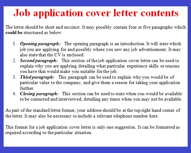 - Second paragraph: This section of the job application cover letter can be used to explain why you are applying detailing what particular experience skills or reasons you have that would make you suitable for the job.
